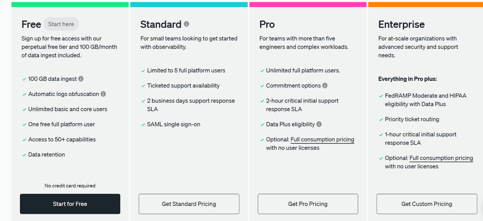 - Free: 100 GB free original data ingestion; $0.60/GB for Data Plus; unlimited basic/core users; 1 free full-platform user.