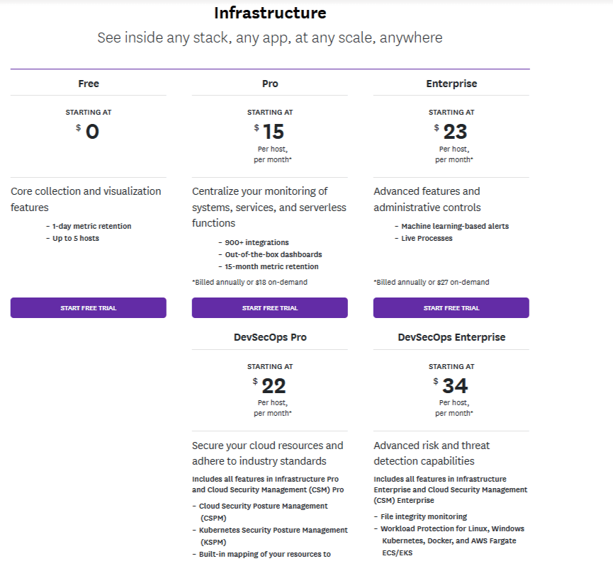 - Infrastructure Monitoring: Starts at $18/host/month (or $15/host/month with annual billing).